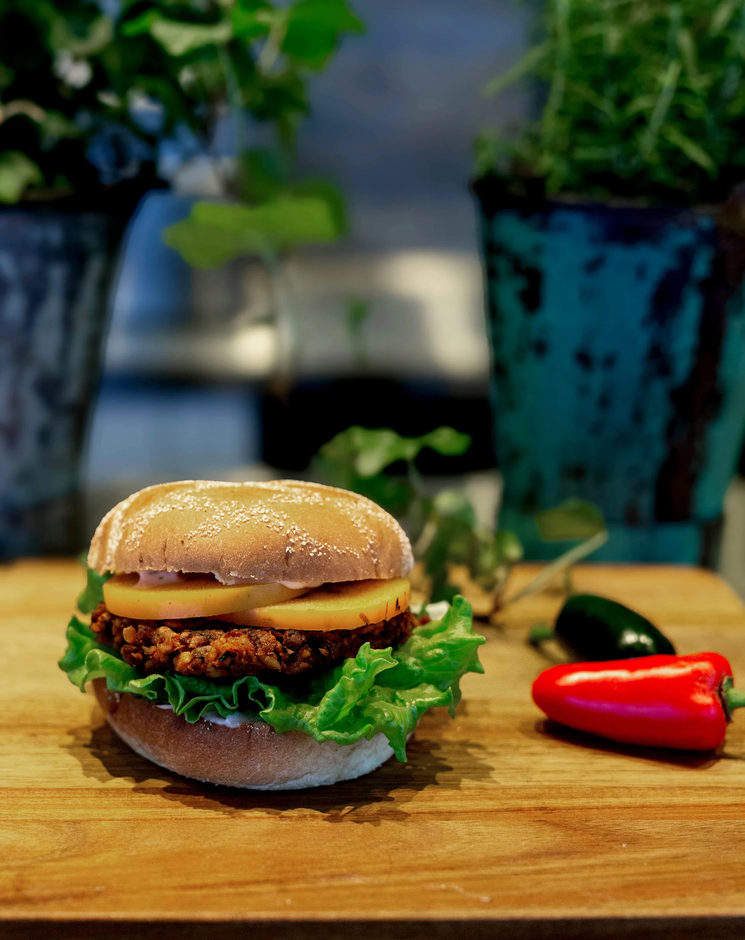 En burgare toppad med picklad chili, krispig sallad och picklad gurka. Senap och toppad med vår krämiga chilidressing.
